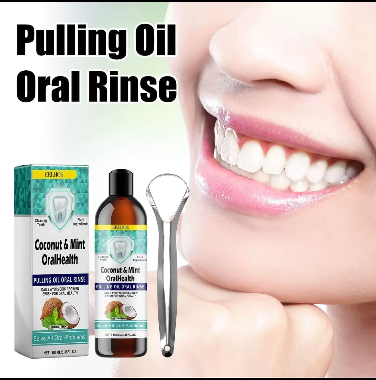 Detox, freshen, and brighten your smile naturally with Coconut & Mint Pulling Oil Oral Rinse and Tongue Scraper for complete oral hygiene.