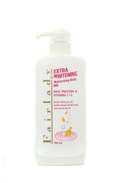Fairlady Extra Whitening Moisturising Body Milk contains milk protein, vitamin c, and vitamin e. Naturally whitening your skin. Specially formulated with milk protein. Leaves your skin silky soft.