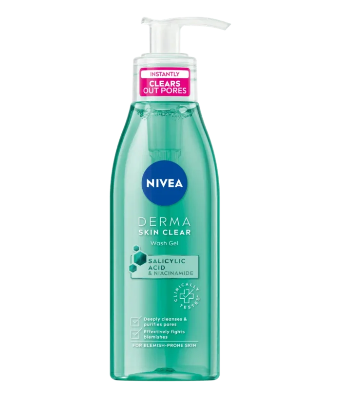 NIVEA Derma Skin Clear Wash Gel helps cleanse your face of dead skin, which is deposited on the surface of the skin, clogs our pores, and creates blackheads. The regular use of the face wash gel helps to unclog the pores and reduces the appearance of blackheads and whiteheads.