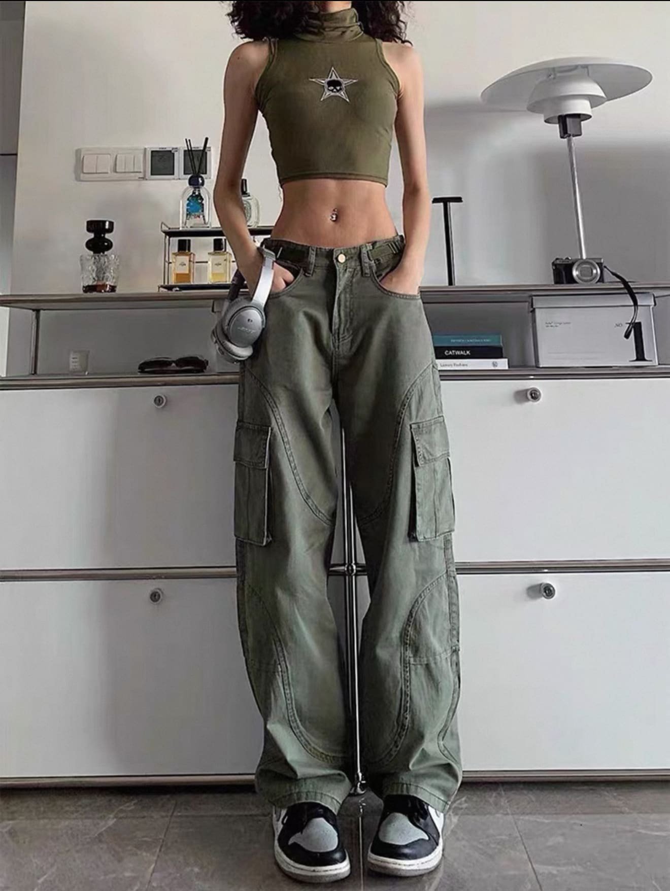 The ultimate slouchy statement. These high-waisted army green cargos are giving serious Y2K meets streetwear baddie. Style with a crop, corset, or oversized tee.